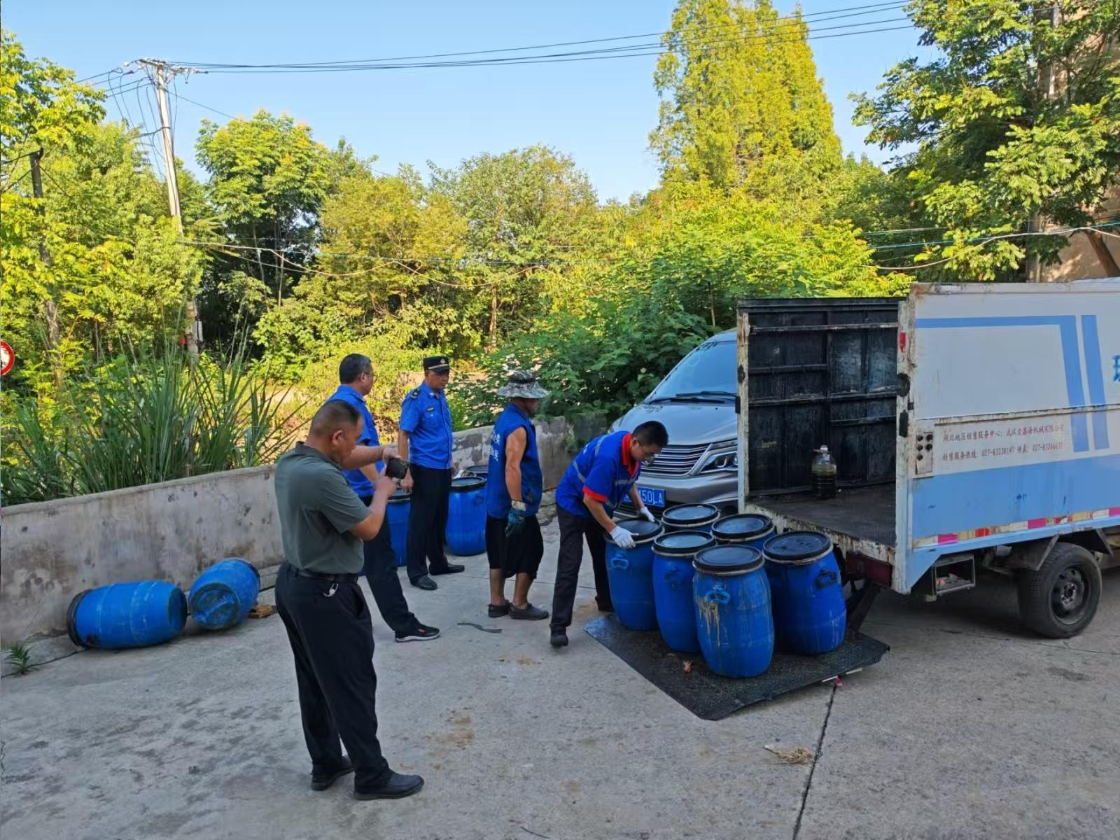 8月14日,江夏区经济开发区综合执法中心藏龙岛执法队在日常巡查中,发现梁子湖大道中洲村附近有一处非法从事餐厨废弃油脂收集的“黑作坊”。江夏区城管执法局迅速联合藏龙岛执法队、中洲村村委会及具有专业资质的暄洁再生资源利用有限公司,果断采取行动,现场依法暂扣非法收集的废弃油脂6桶,总计重量超过1吨。当天,极目新闻报道了此事。