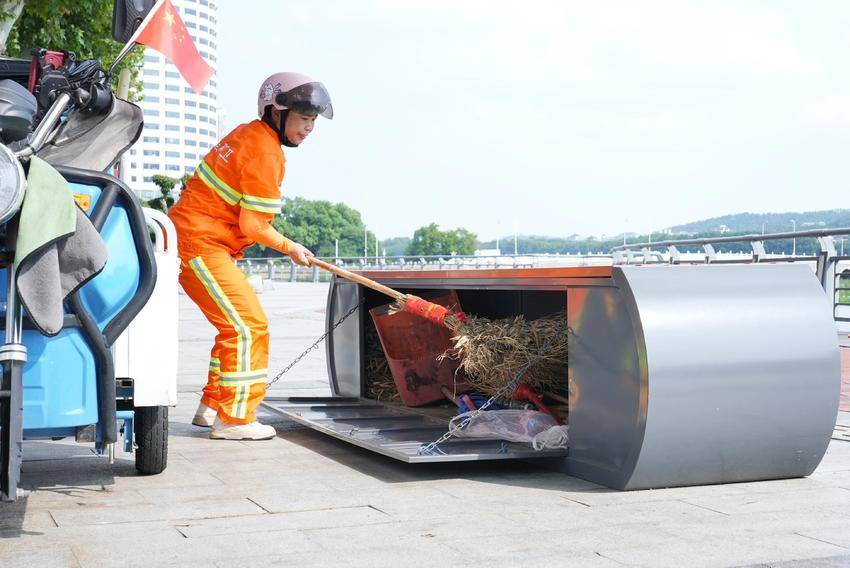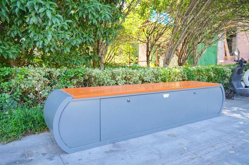 “外观整洁美观,远看像供人休憩的长椅,近看藏着大用途——柜子打开能轻松存放扫帚、簸箕等清扫设备。”班长张燕介绍,大扫把因携带不便,放置在柜子中,环卫工人随用随取。