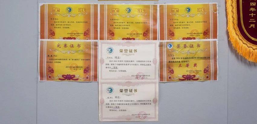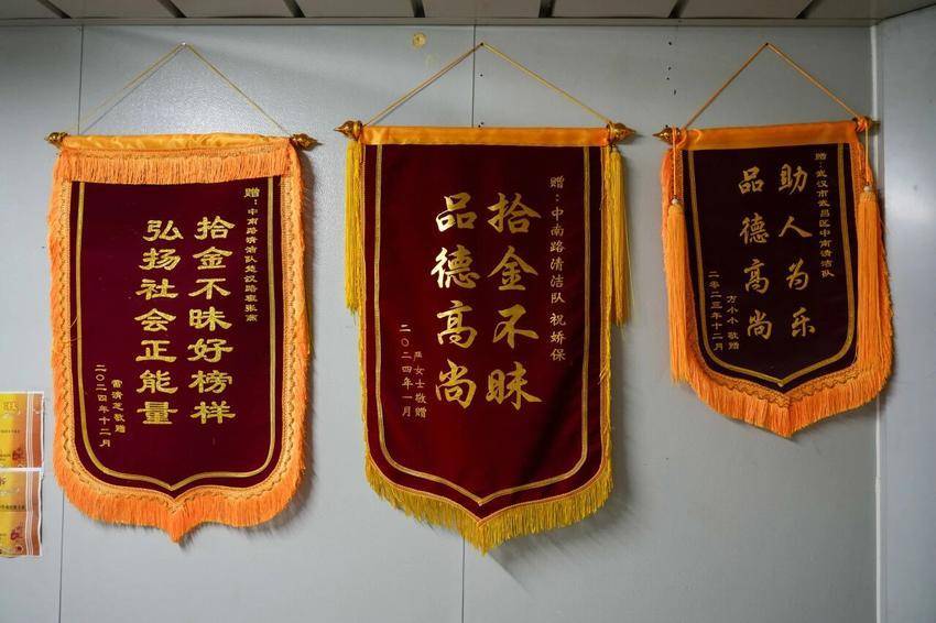 走进楚汉路班的工作休息间,首先映入眼帘的是挂满了整面墙的“助人为乐”“拾金不昧”“救助动物”等各式锦旗和奖状,将工作间点缀得格外温馨。“这季度的‘好人好事班组’流动红旗也被我们拿回来了!”班长张燕自豪地介绍着班组成员历来的善行义举。