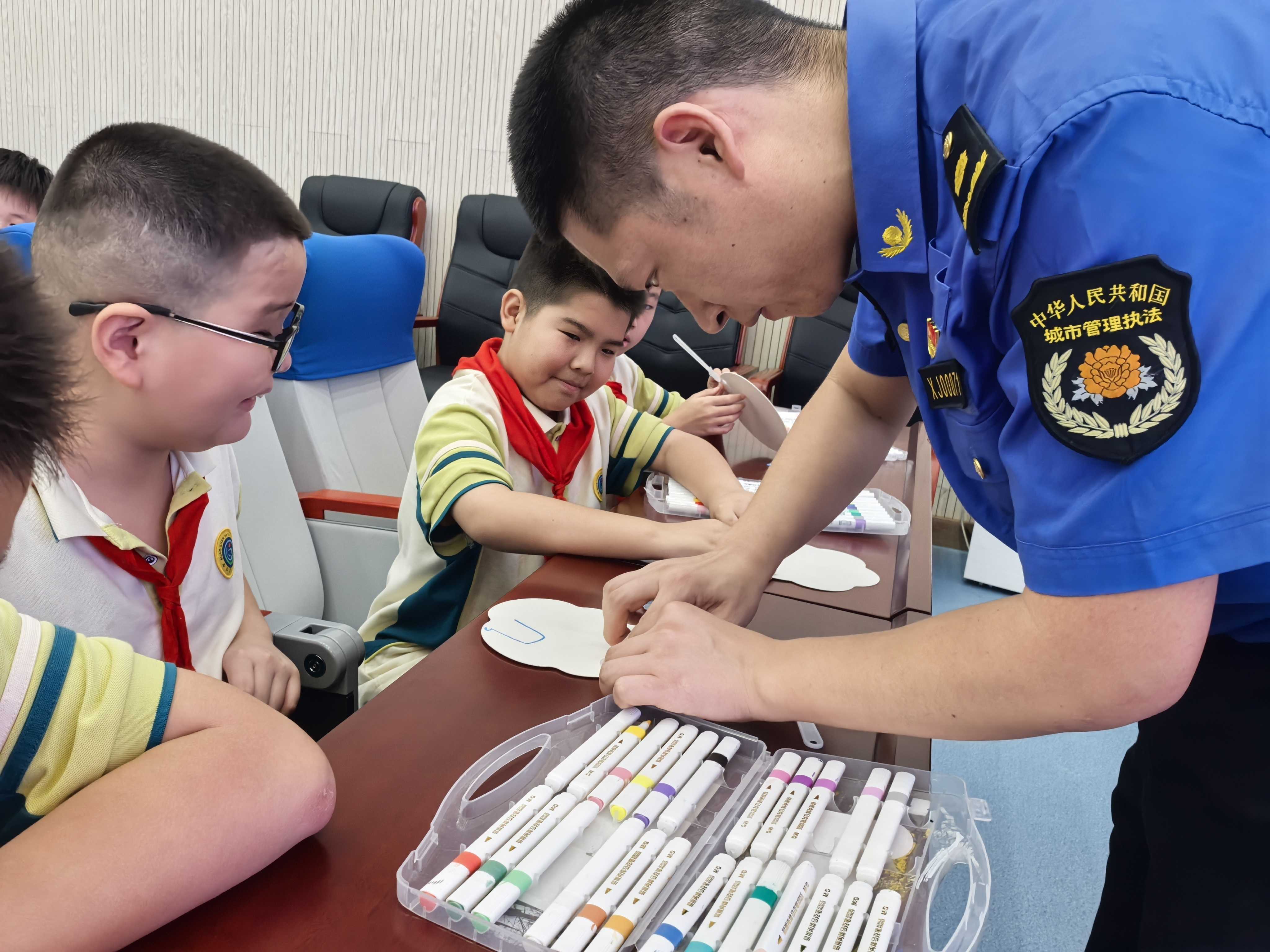 从课堂上侃侃而谈的“分类蓝讲解员”,到团扇旁俯身指导的“手工指导员”,再到倡议台前率先签名的“环保引领者”,最后到画卷边蘸色留印的“掌印参与者”……江夏城管的党员干部们全程用心陪伴,将“城管蓝”的热情和“生态绿”的希望慢慢融进了同学们的日常认知里。