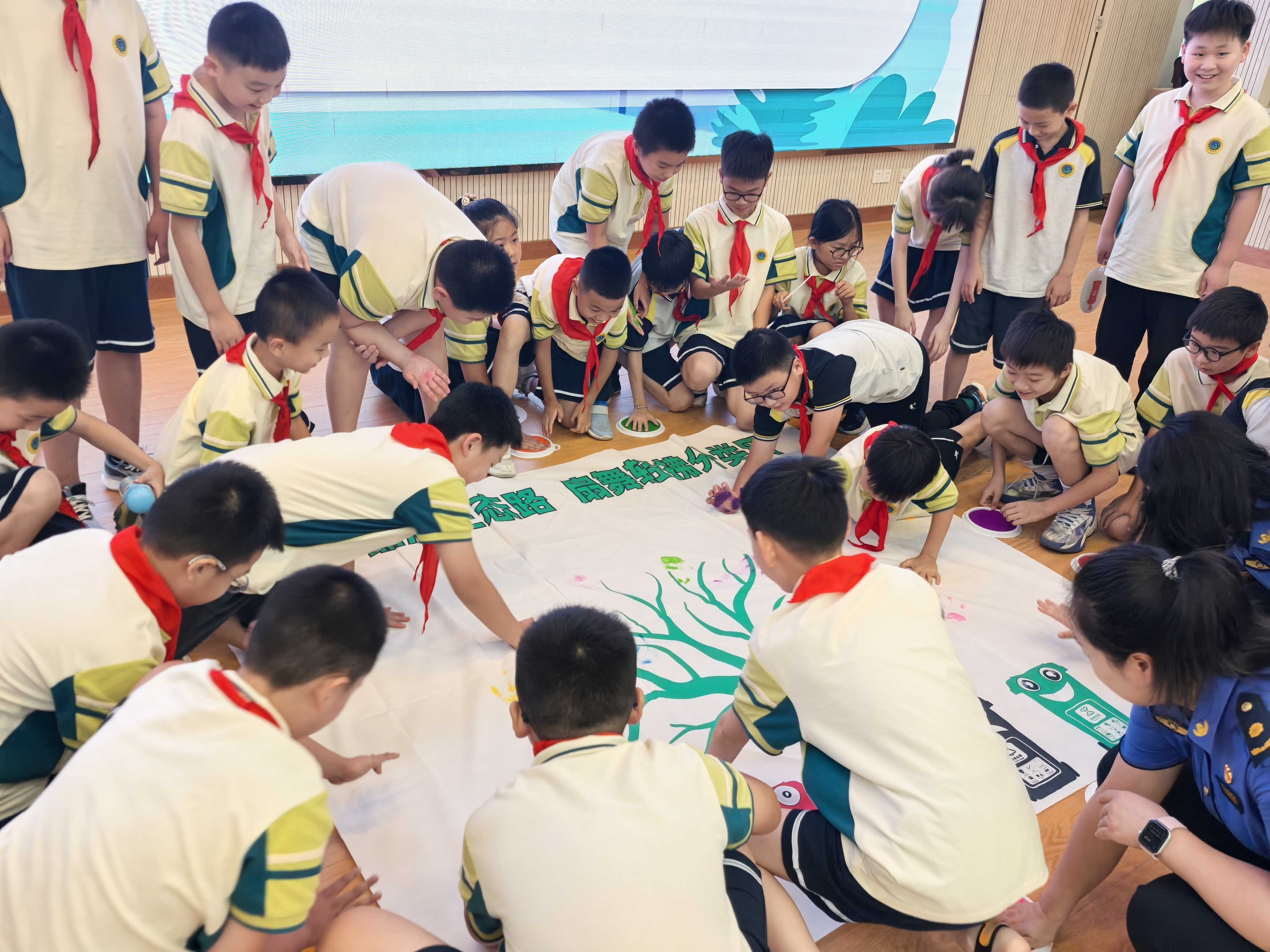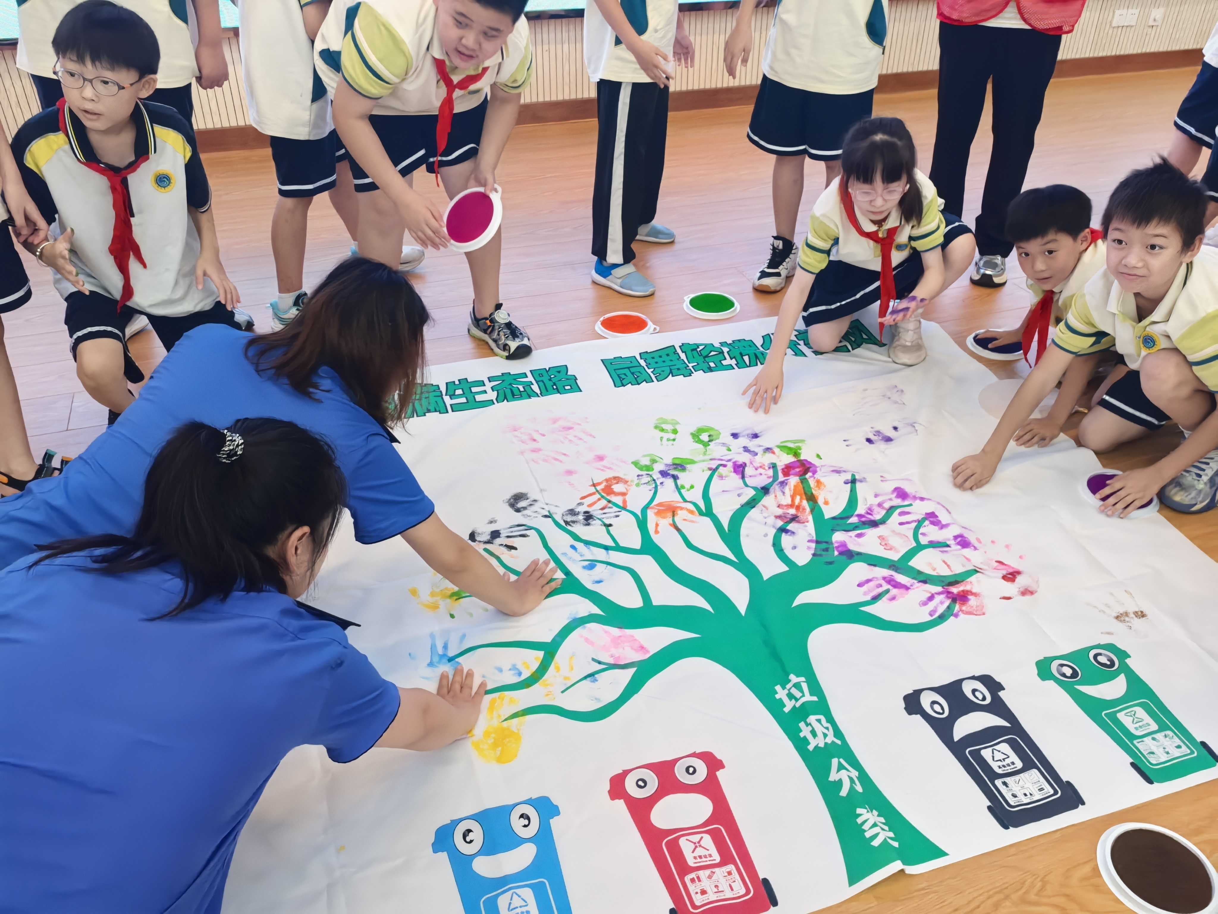 紧接着,大家用手掌蘸上五彩斑斓的染料,在长达数米的垃圾分类宣传画卷上按下一个个环保掌印,红色的热情、绿色的生机、蓝色的纯净……不同颜色的掌印交织在一起,既印下了师生与城管共同守护环境的约定,更具象化了“城管蓝”与“少年绿”携手共创垃圾分类新文明的美好愿景。