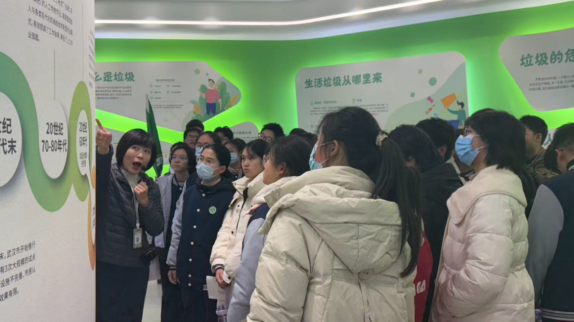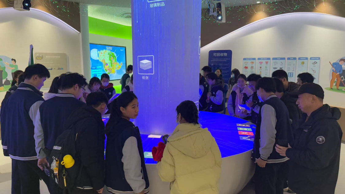 研学第二站,来到东西湖区垃圾分类宣教馆,这里的垃圾分类知识直观又有趣。刚一进馆,高清语音介绍幕、收运路线互动屏、智能分类投放柱等现代化互动设施,就牢牢吸引了大家的注意力。同学们迅速分成小组,围在互动设备前踊跃尝试:有的对着投放柱反复练习分类投放,直到屏幕显示“投放正确”才露出笑容;有的在收运路线互动屏上点击操作,直观了解不同垃圾的收运去向。在轻松有趣的互动氛围中,同学们不仅精准掌握了垃圾分类的标准,更认识了我区垃圾“分类投放—专业收运—集中处理”的闭环体系。