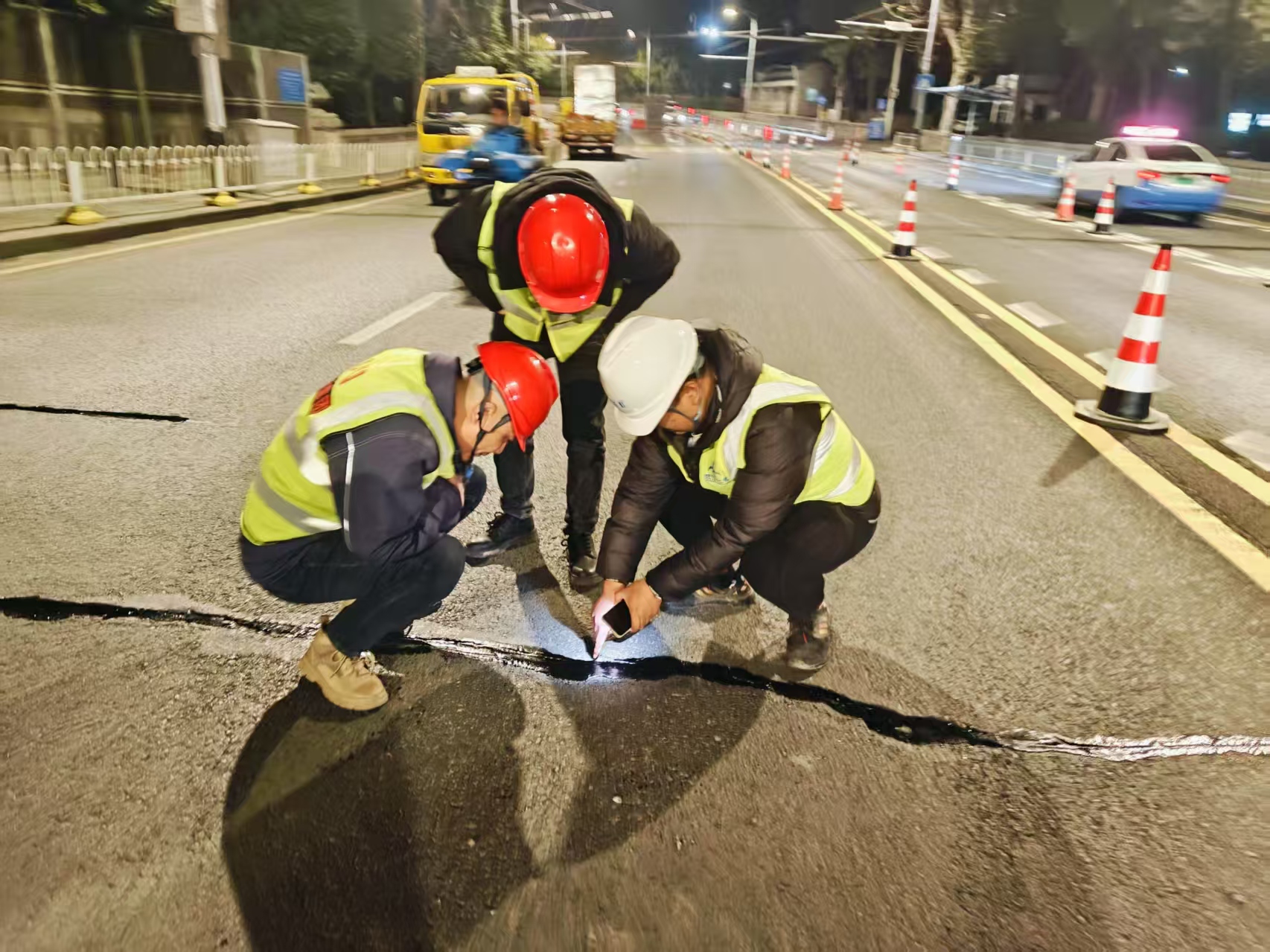 工程采取"夜间错峰+分段施工"模式,每日23:00至次日5:00封闭两车道作业,保留双向通行能力。施工期间引入北斗定位系统实时监测摊铺平整度,采用异步专用撒布设备确保还原剂均匀覆盖。目前已完成裂缝封闭及60%铣刨修补,预计3月20日全面完工,较常规工艺缩短30%工期。