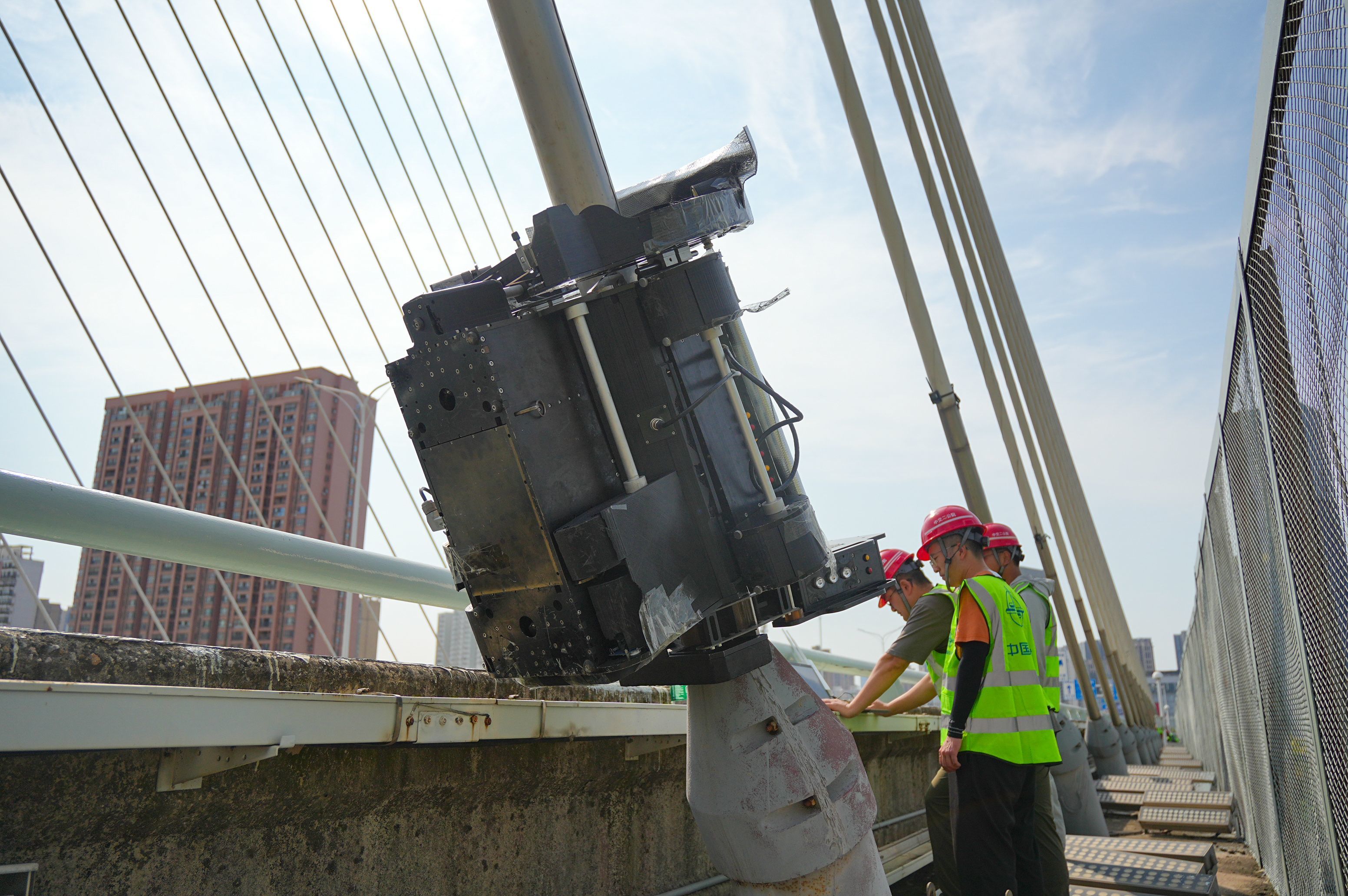本次年度定检综合运用多样化的检测手段,通过多功能路况车、SFC横向力系数车等高效普查路面状况,借助无人机对大型桥梁进行空中巡检,并综合运用桥检车、无线云台摄像杆、皮划艇等设备对关键部位进行“抵近式”勘查;运用图像综合测量系统、无人机智能检测系统等对难抵近部位进行“智能化”检测;运用拉索智能检测机器人对高空索杆进行“自动化”检测。