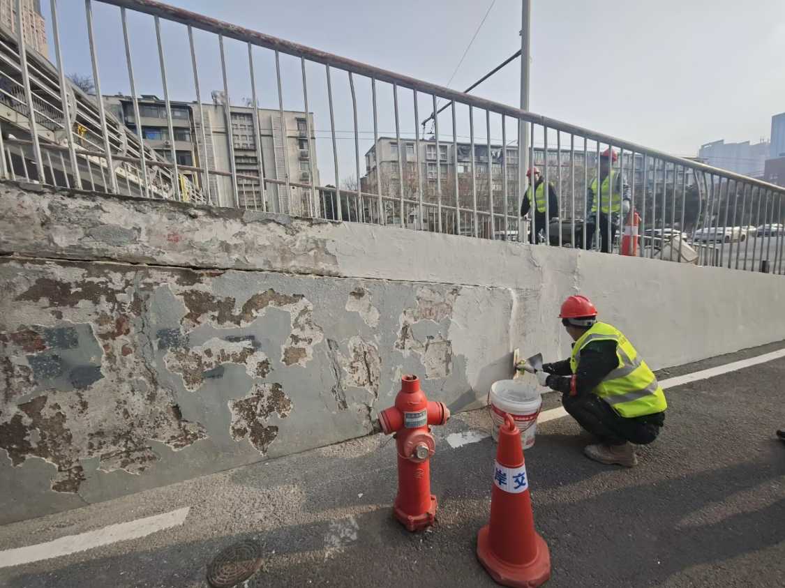 迎新年,换新衣。1月28日,江岸区台北路人行天桥上,市政工作人员身着防护装备、手持工具有序作业,重点推进护栏除锈、打磨抛光、坡道砼面刮腻子等前期工序,细致清理护栏锈迹与破损部位、抚平坡道砼面凹凸不平处,为天桥后续涂装、换上“新衣”筑牢基础。