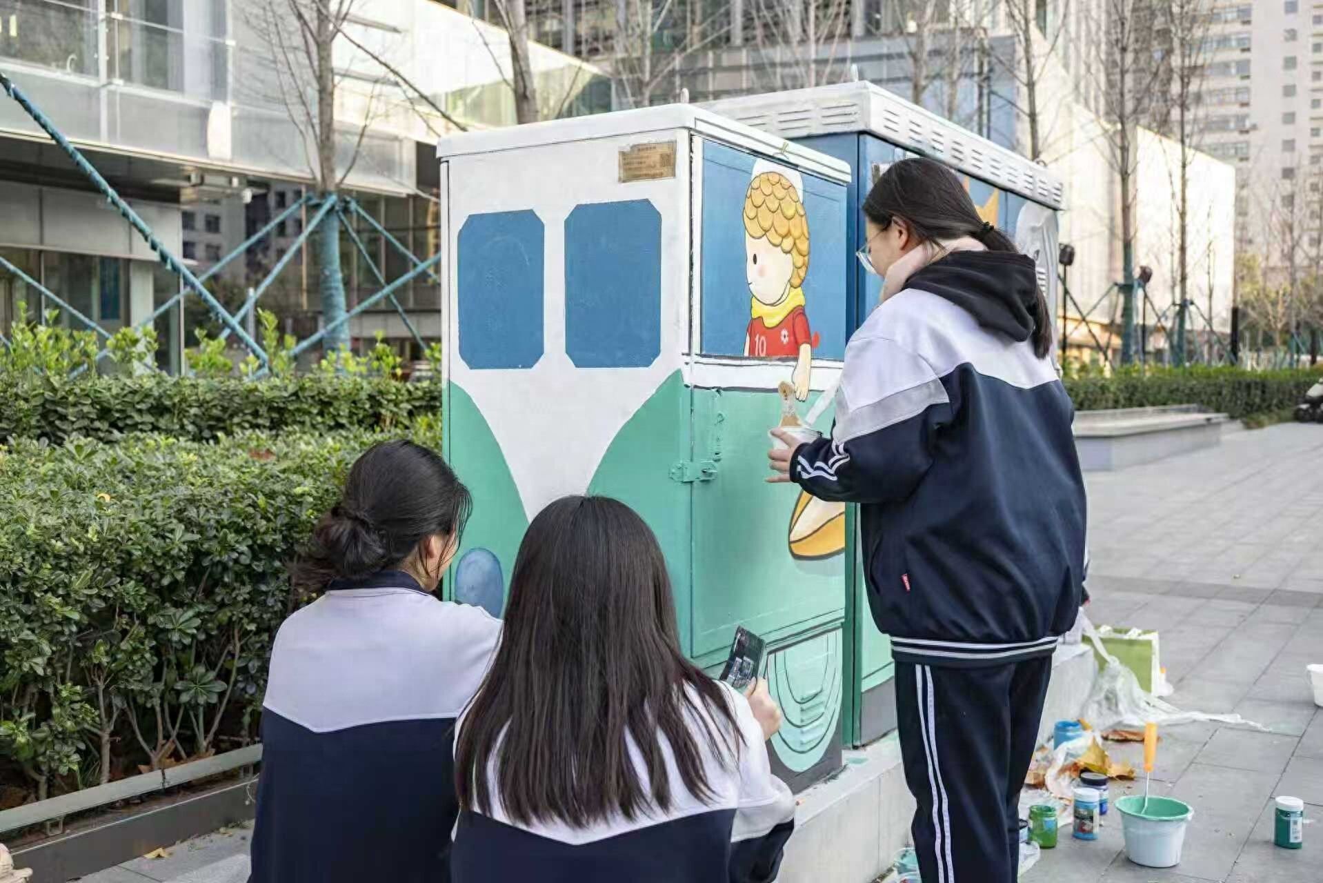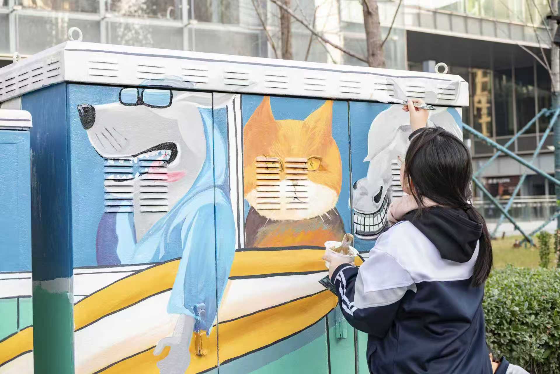 “能亲手为自己每天走过的街道添上一笔色彩,感觉特别有意义!”参与绘制的高二学生王若璎一边清洗画笔一边分享道,“平时总觉得城市建设离我们很远,但今天发现,原来我们也可以用艺术的方式参与进来,让周围的环境变得更美。”另一位同学张欣雨则表示:“在箱子上画画和纸上很不一样,要考虑到材质还有室外效果,虽然有点挑战,但看到成品慢慢出现,特别有成就感。好像我们和这座城市有了更深的联系。”