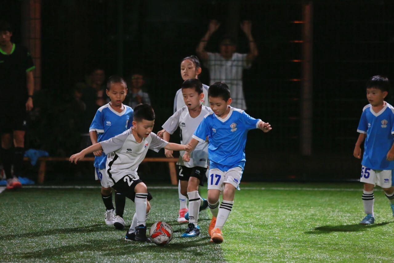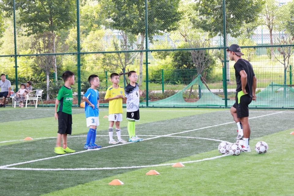 足球场上,教练正带领小朋友开展足球训练,朝气蓬勃的孩子们在绿茵场上奔跑传球,笑声与欢呼声此起彼伏。