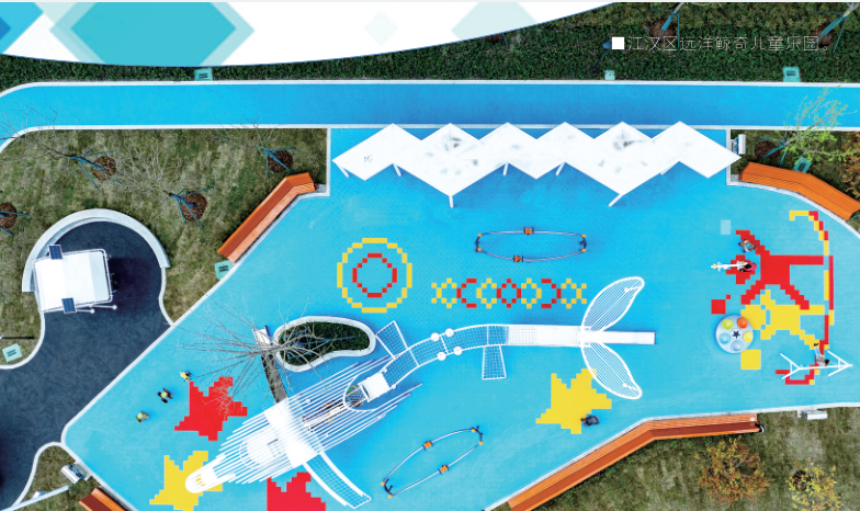 江汉区常青街,一片曾经的工棚荒地,如今是充满“多巴胺色彩”的远洋鲸奇儿童友好公园。550米蓝色环形跑道如海浪串联全园,中心白色鲸鱼造型的趣玩区、滑板乐园、“鲸奇篮球”区域,满足了3至12岁不同年龄段孩子的玩乐需求。与此同时,公园改造秉持“无障碍、通透、适合亲子”理念,设置高低洗手台、室内书吧,将儿童游乐区与林荫休憩设施、老人活动区等统筹布局,兼顾儿童安全与全龄友好,用一米高度看城市、看世界、看未来。