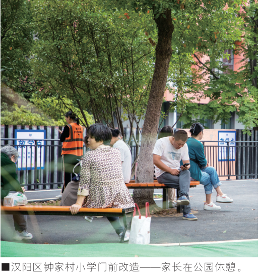 同样的“梗阻”也出现在校园门前。汉阳区钟家村小学三里坡东校区南侧,一处公园绿地悄然变身为学生专用接送点。曾经每到上下学,校区门前的高龙路都堵得水泄不通,接送车辆、通勤车流叠加,占道停车、非机动车逆行等现象频发,不仅拥堵严重,更存在安全隐患。为从根本上解决问题,汉阳区城管、交警等多部门联动,利用校园旁公园绿地开辟出一条110米的防滑步道,成为学生放学专用通道,实现了人车分流。“再也不用和机动车抢道了,安全又省心!”家长李女士的感慨道出了治理的成效。汉阳区通过“小微改造、精细治理”,利用现有公园绿地资源,不新增建设用地,便巧妙化解了长期存在的拥堵难题。