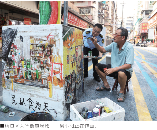 在硚口区荣华街道,一幅长达10米的美食主题墙绘突然“出圈”,成为硚口区荣华街头一道亮丽的风景。受街道邀请,68岁的退休教师易小阳用画笔为老街注入了全新的活力。他的120多幅墙绘,将市井烟火、老街风情、身边人物定格于墙面,不仅美化了环境,更巧妙化解了“牛皮癣”、垃圾堆放等治理难题。如今墙面不仅成为热门打卡点,带动了街区人气,还显著减少了随意张贴小广告的现象。更令人欣喜的是,其他的餐饮商户为了能够“上榜”,也开始主动改善店面环境、提升卫生水平。当艺术浸润街巷,居民、商家成为画中主角,城市管理便不再是冷硬的规训,而成为一场温暖人心的共同创作。荣华街道的这一创新举措,不仅以艺术之美化解了城市治理中的诸多难题,更在潜移默化中唤醒了居民“我爱我家”的情感认同,激发大家主动参与身边“微环境”的共治共管。