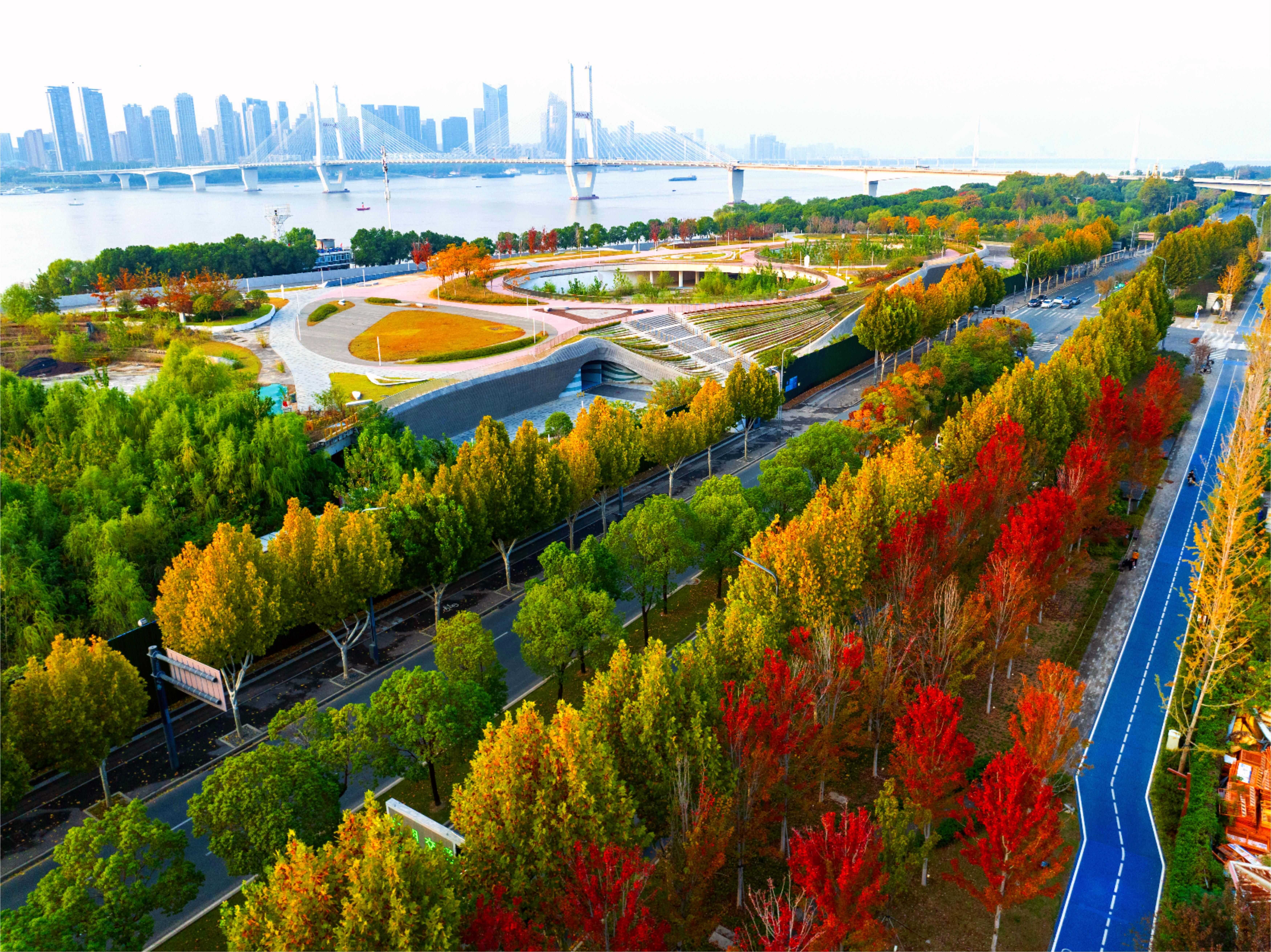 工业遗产也在“绣花功夫”下实现华丽转身。位于鹦鹉洲长江大桥附近的武昌湾江滩,以“历史传承、生态融合、活力共享”为核心理念,通过堤防改造、护岸坡加固与景观绿化等举措,让旧厂区的钢铁脉络与江滩的碧波绿意相映成趣。项目改造依托原武船厂区工业遗产与长江自然景观,贯通武汉百里长江生态廊道的“最后一公里”,连接武昌古城与滨江商务区,提升防洪能力与城市品质。