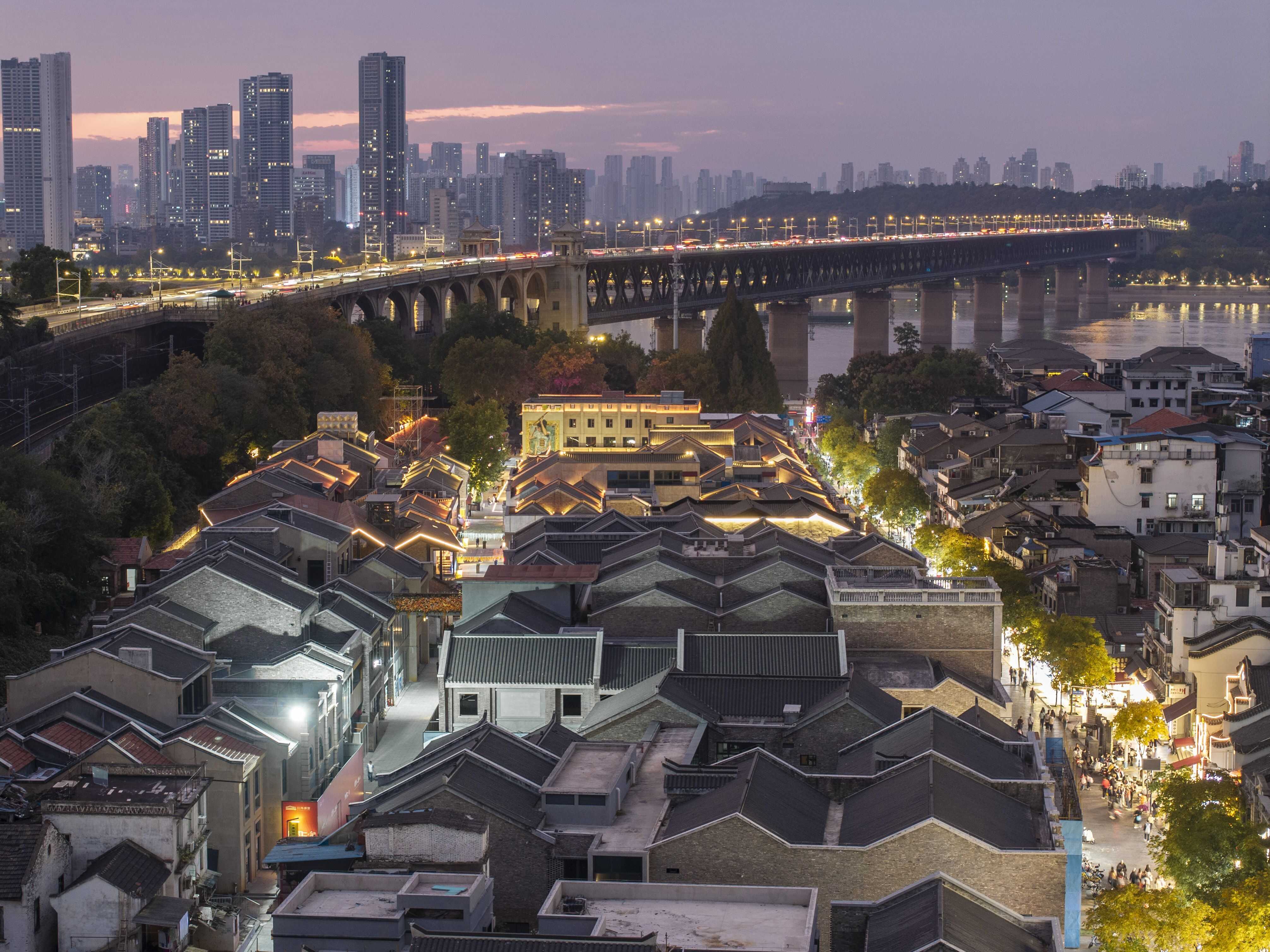 京广线武昌入城口的斗级营,曾是宋代古巷与明代粮仓的所在地。如今成为文化新地标。改造中近一半的历史建筑得以保留并焕发出新的生机。徐荣廷公馆一分为二,立中堂国民影像艺术馆内照片诉说往昔;唐书汉旗旗袍店提供换装打卡服务,让游客仿佛穿越时空;华拾书店以诗词为主题,当耳边火车呼啸而过时,店内诗词澎湃激昂,营造出独特的文化氛围;漫咖啡背靠蛇山,长江景观与老武昌魅力在这里完美融合。夜幕降临,仿萤火虫灯串与市政路灯同步亮起,以竹节元素打造的“斗里有市集”设有18个摊位,与户部巷隔街相望,既延续了古城的市井烟火气,又注入了时尚活力。