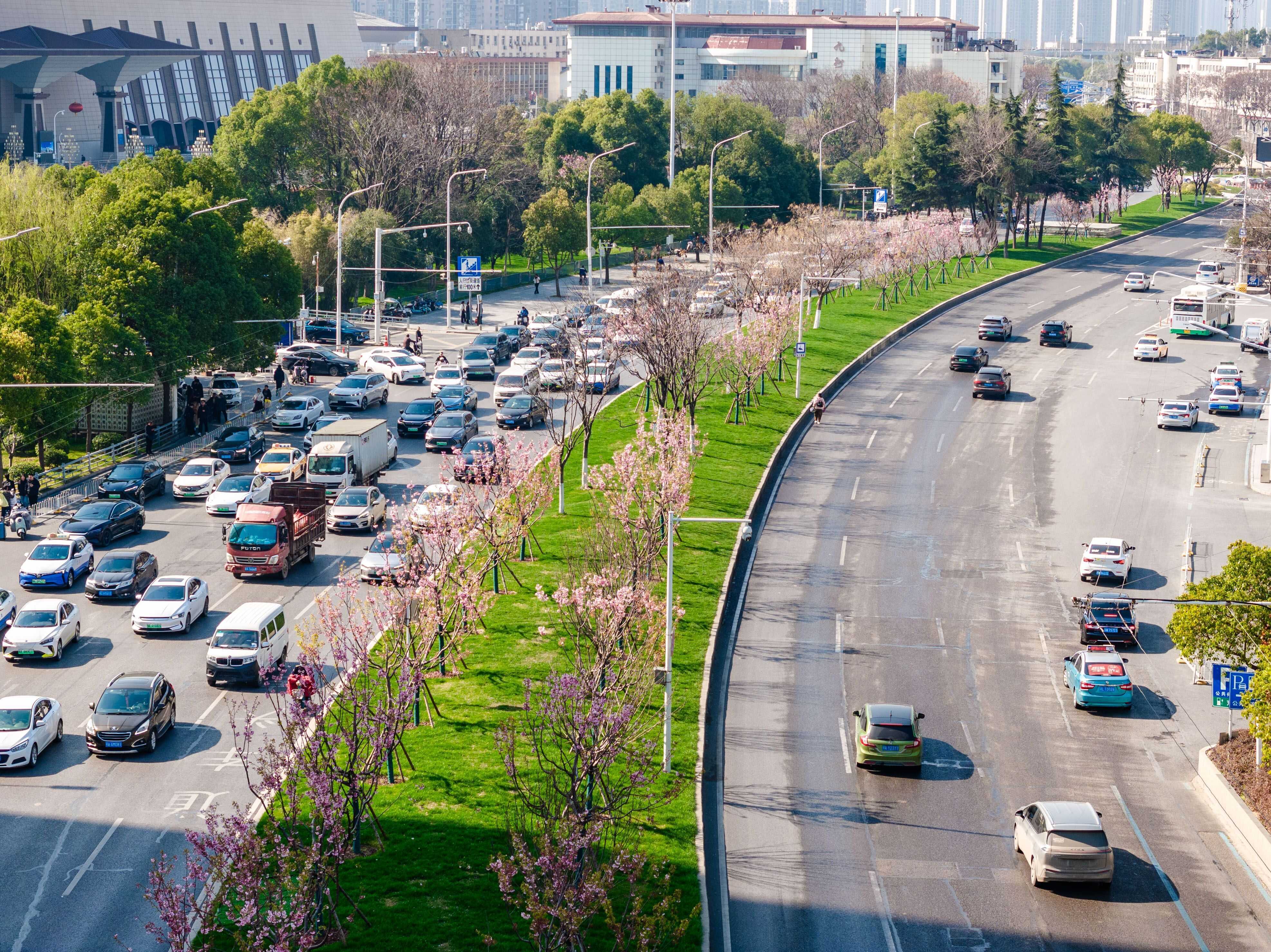 武昌火车站前花坛曾因灌木杂乱、视野不通透等影响景观品质。武昌区城管部门改造时移除中层灌木,保留高大乔木,铺设阳光草坪,以染井吉野樱与阳光樱为视觉焦点。施工过程严格把控细节,如草坪坡度确保排水顺畅,樱花栽植点位经日照模拟保证受光均匀及最佳观看距离。改造后,春日樱花绽放时,粉白的花朵映着翠绿的草坪,阳光洒下斑驳光影,让繁忙的道路增添了一分温柔。这片樱花林已成为武昌给四方旅客的诚挚邀请函。