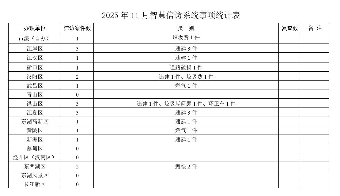 2025年11月,我委共受理各类信访、投诉、信息公开31件,当月办结15件,其中: