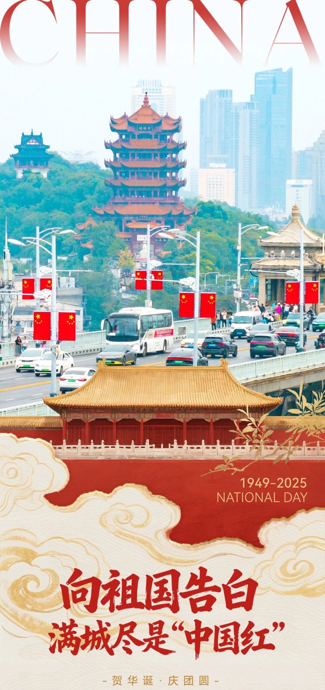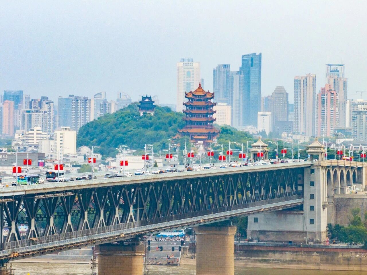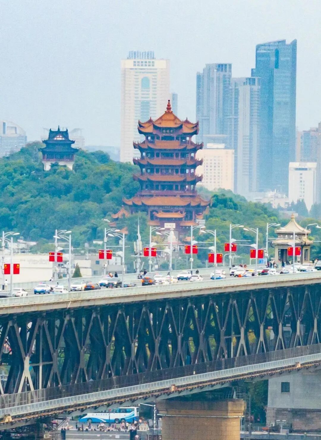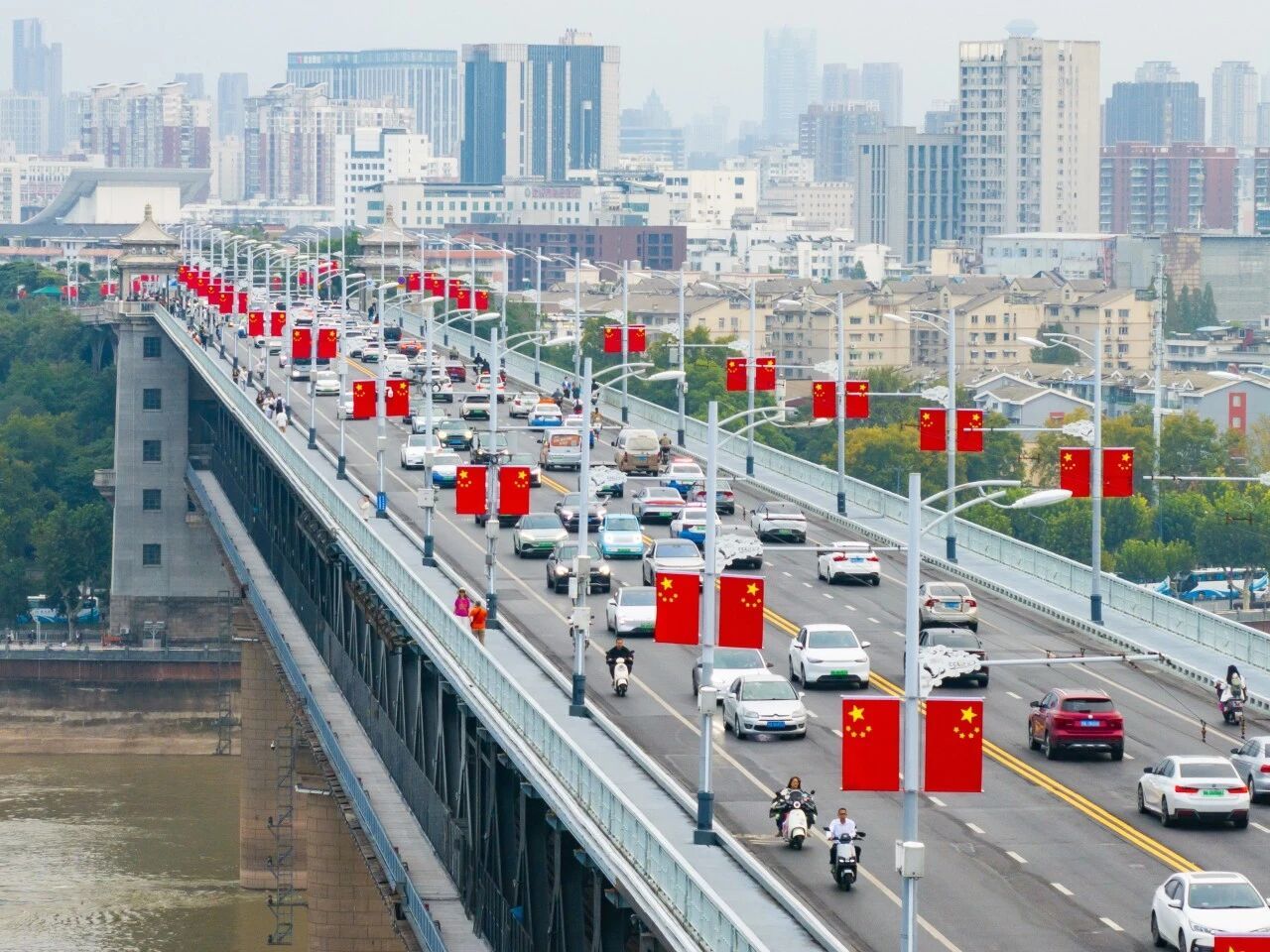 “一桥飞架南北”的武汉长江大桥上,两侧的五星红旗迎风飘扬,用一抹“中国红”描绘出“天堑变通途”的壮丽画卷。五星红旗与黄鹤楼的光影交相辉映,历史的厚重与时代的辉煌在此刻交织,每一位游客和市民都能感受到扑面而来的家国情怀。