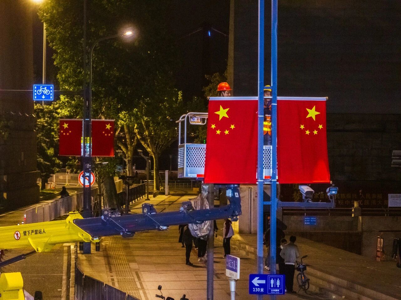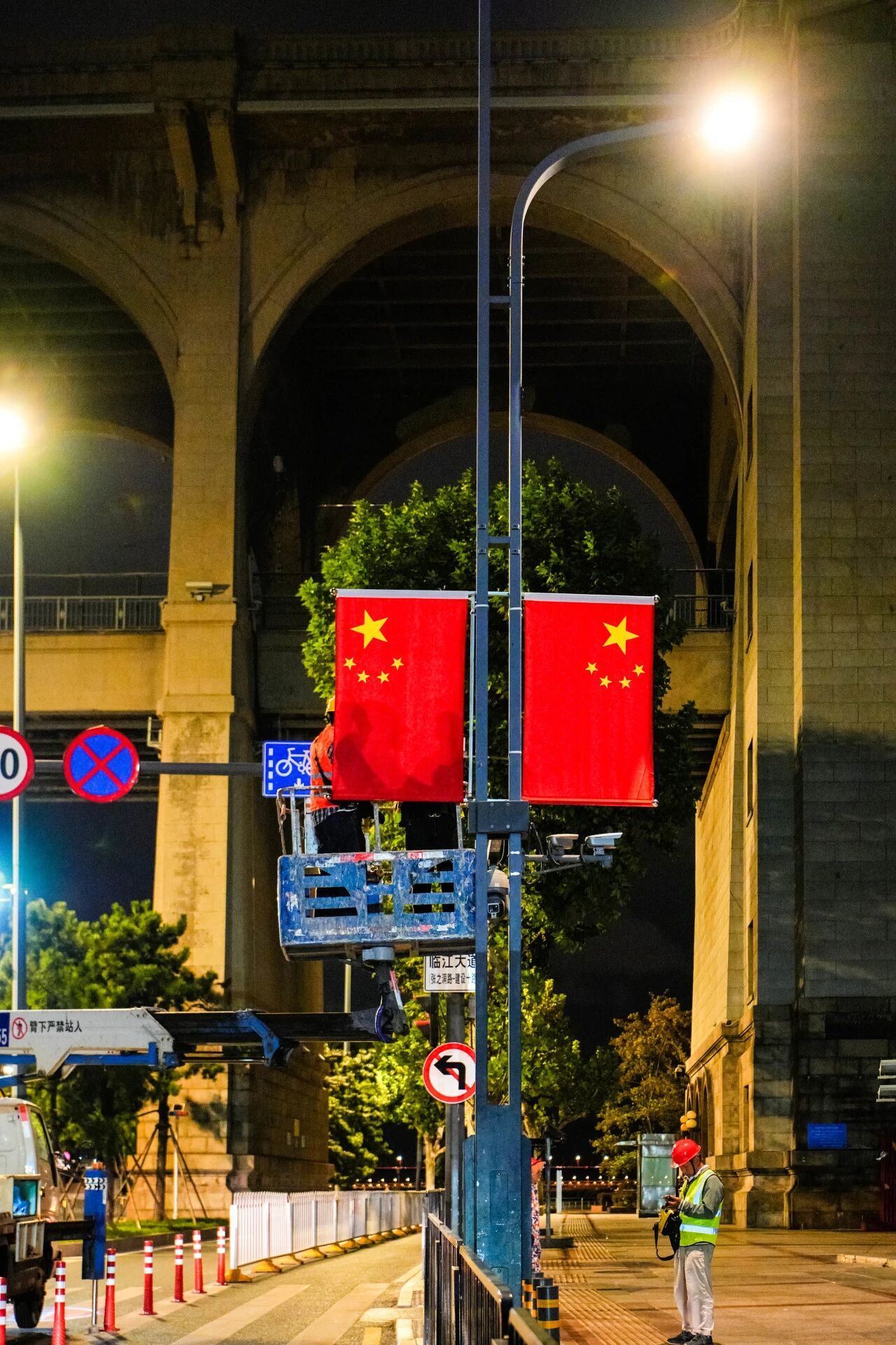 凌晨1点的临江大道上,施工人员四人一组井然有序地登上登高车。操作手精准操控升降台,两名工人则严格依照悬挂标准,确保每一面红旗都如火焰般舒展飘扬。
