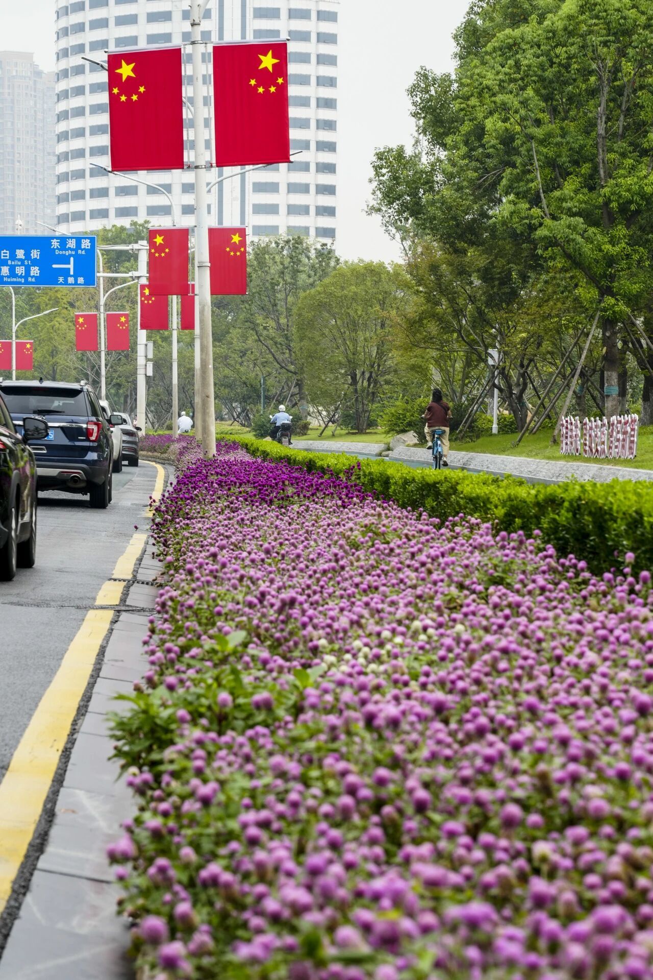 武珞路、楚汉路、天鹅路、洪山路等道路上,布置了约1200平方米的繁星花、一品红、百日草、长春花、等时令花卉争相竞艳,其间还有孔雀草的明黄、长春花的粉白、香彩雀的淡紫,在道路上铺就数公里“彩虹花径”。