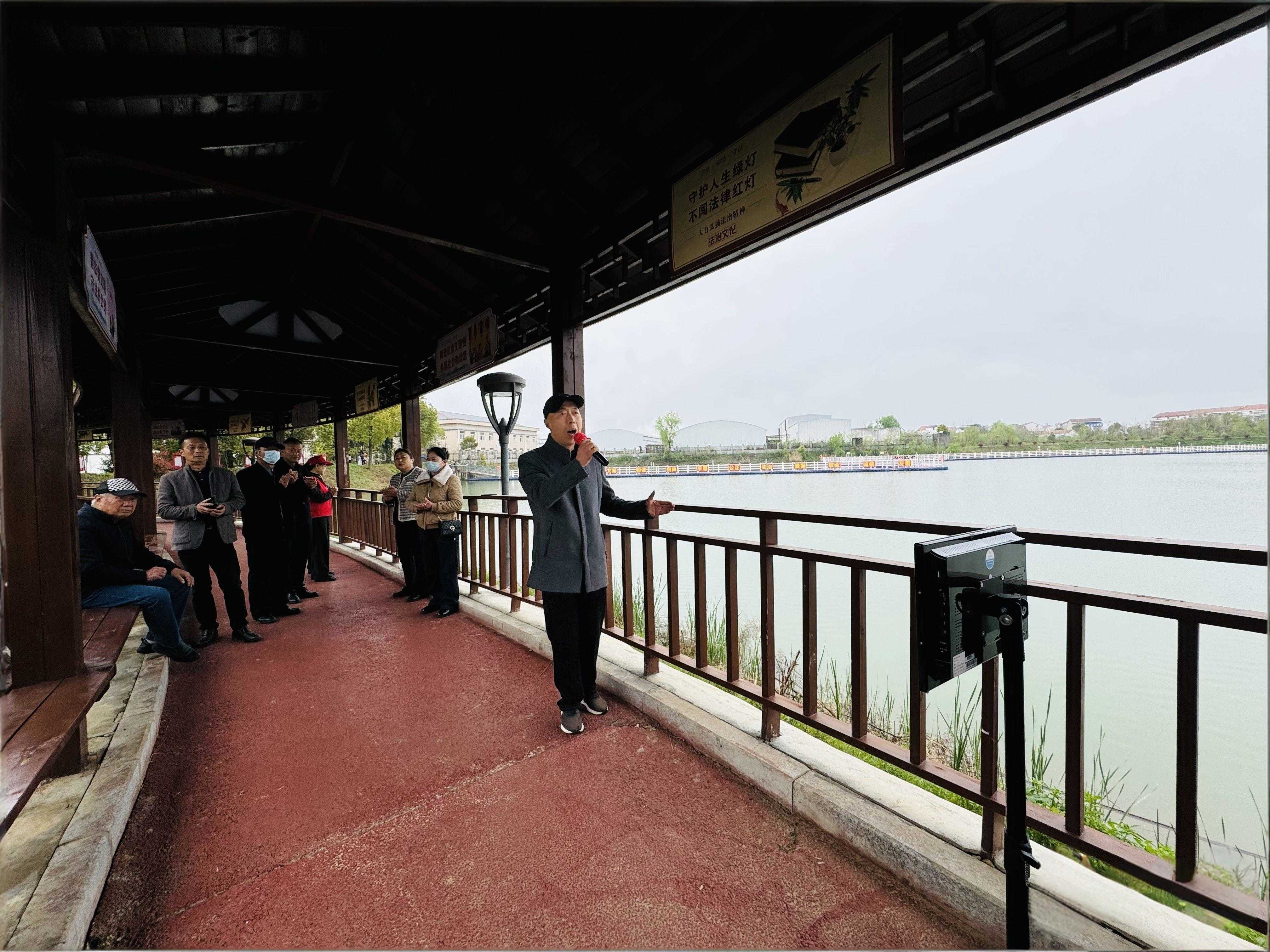 4月3日下午,循着潘塘路步入水库步道,随着深入,一阵阵悠扬的歌声渐入耳来。在水边长廊内,几位村民正兴致盎然地使用移动卡拉OK设备纵情高歌。一曲终了,退休教师郑全发收获了热烈的掌声。