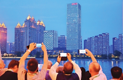 沿江继续前行,336米的武汉长江航运中心项目主楼主体结构已封顶,建成后将成为长江中游最现代化、国际化、服务功能最完备的港务枢纽综合体。