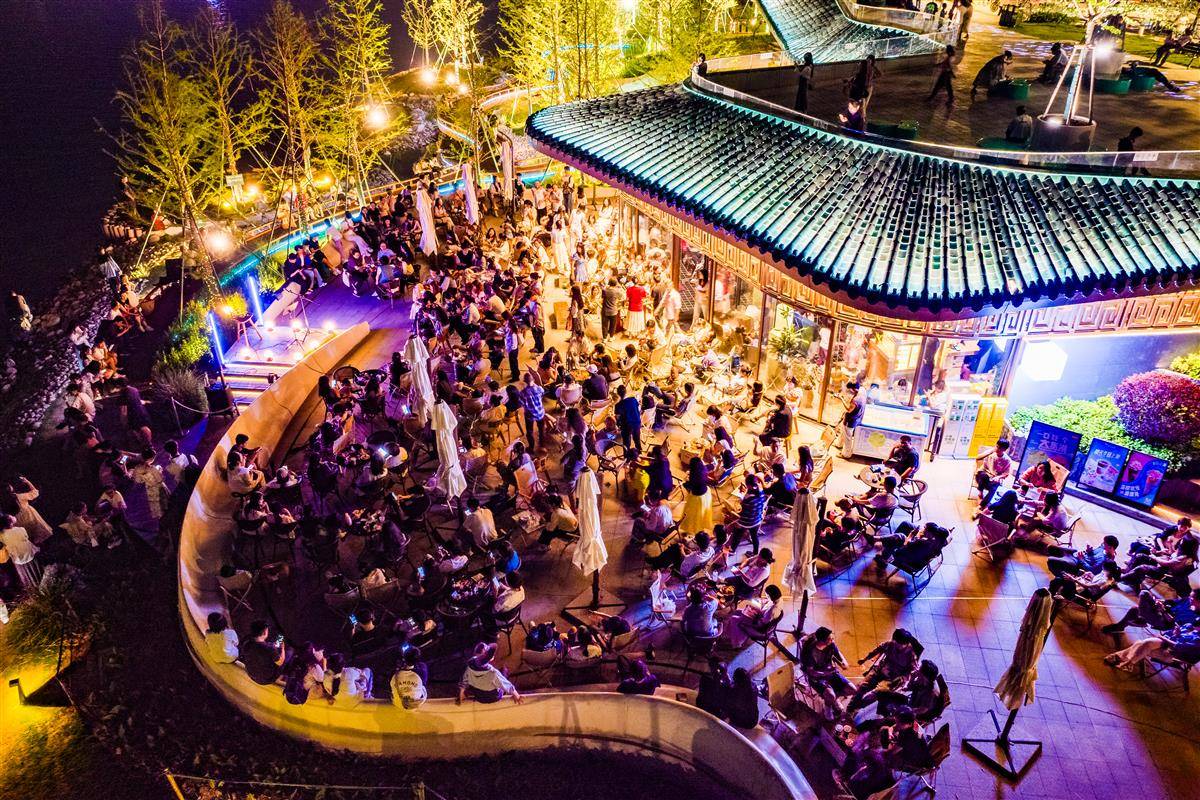 △东湖凌波门旁的湖山咖啡店夜晚举行音乐会,附近学子和各地游客在此吹风赏景。