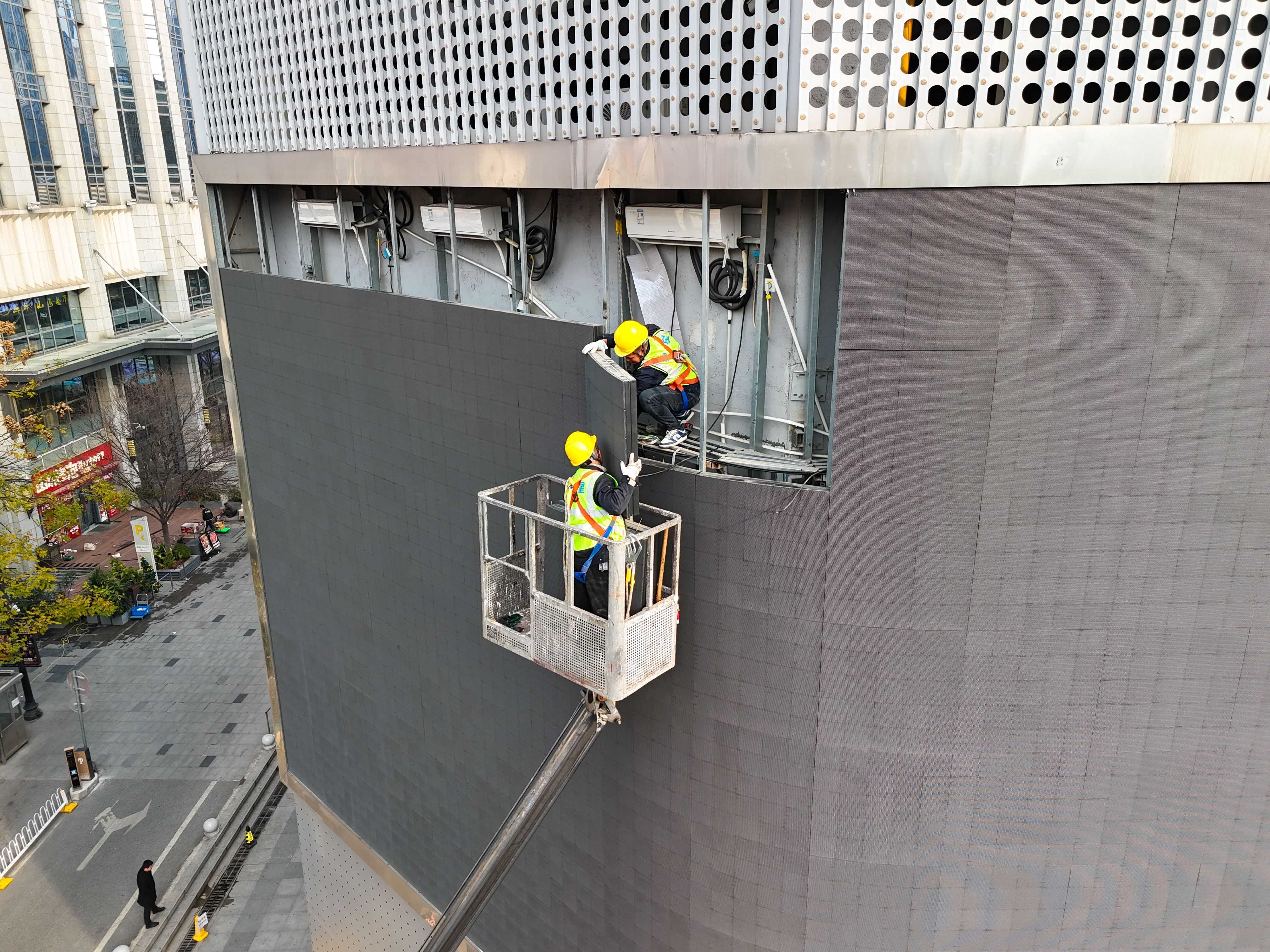 拆除工作当日,在街道与物业公司的协同配合下,工作人员提前划定安全警戒区域,疏导过往行人和车辆;专业作业人员在统一指挥下,借助直臂式高空升降车稳步作业,严格遵循规范操作流程,依次完成线路切断、结构分解与拆除下放等工序。整个拆除过程井然有序,未对商户及周边居民造成影响。