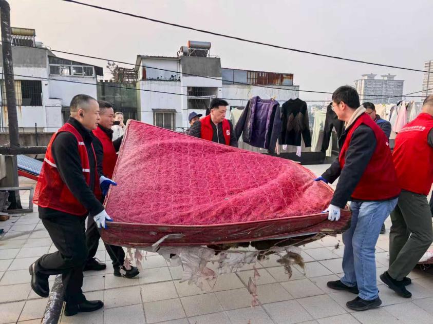 整治指令下达后,街道、社区工作人员和天呈祥环卫和街道环卫、志愿汇志愿者一起组成的小分队迅速集结,在楼顶到楼道间拉起一条紧密的“人链”:最上方的志愿者弯腰扛起厚重的旧床垫,稳稳递向下一位;中间队员踮脚接力,传送沾满灰尘的木板;楼下的志愿者则负责接应,将杂物逐一从8楼搬运至地面。“小心砖石棱角!”“床垫重心偏,大家一起抬稳!”此起彼伏的提醒声中,原本杂乱不堪的楼顶逐渐露出干净的水泥地面。