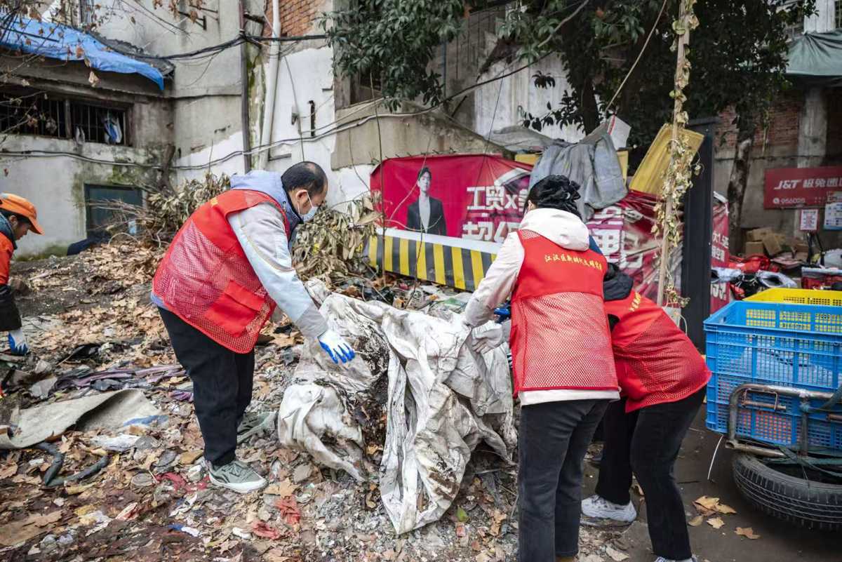 这是江汉区“i武汉i家园”清洁周积存垃圾专项整治行动中的一幕。该行动自2月2日启动,持续至2月6日,由区城管执法局统筹督导,各街道协调资源,社区及相关单位具体落实,对背街小巷、老旧小区、楼顶平台、闲置空地、工地围挡内、绿化带及各类卫生死角展开地毯式排查与清理,力争实现生活垃圾全面清零、建筑垃圾应清尽清。