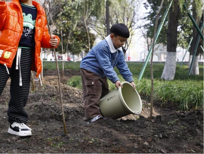 植树环节,“豆皮”也没闲着,用机械臂托举小树苗送到排队的孩子们手里。接过树苗的孩子们干劲十足:在紫阳公园管理处工作人员指导下,有的拿着铁锹挖树坑,鼻尖冒汗也不肯停下;有的小心翼翼把树苗放进坑中,轻轻埋土,还不忘用脚踩实;有的拎着小水桶来回浇水,认真对着小树苗许愿“希望你快快长高”。