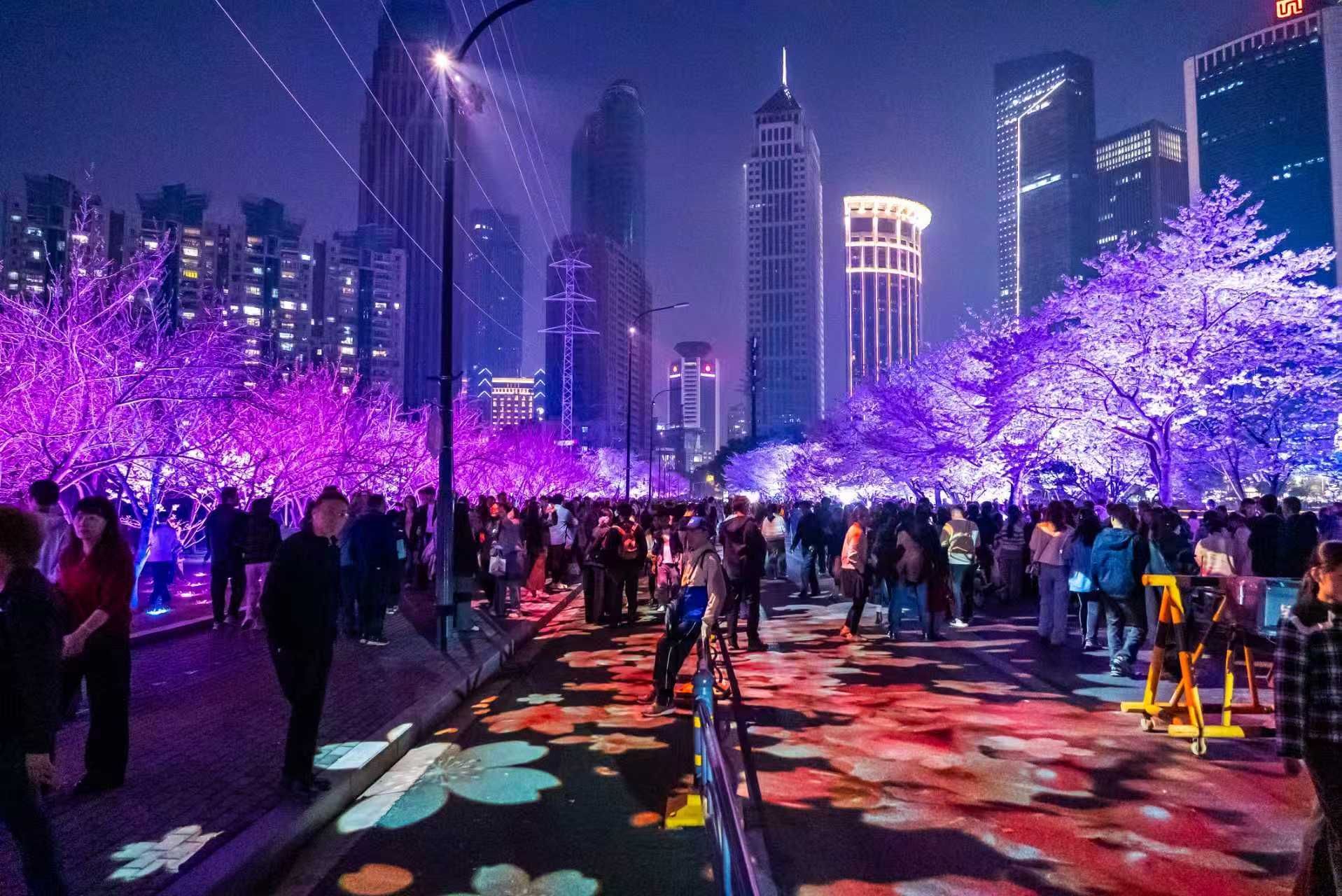 “妈妈快看,花瓣在脚下跳舞!”一个小女孩兴奋地指着地面,飞舞的花瓣、流动的江汉揽胜图投射在路面上,铺就了几十米长的梦幻“地毯”。“以前只能在人行道上挤来挤去,现在能大大方方站在路中间拍照,花海效果太震撼了!”专程来汉赏花的李女士一边调整角度,一边兴奋地展示刚拍的照片。