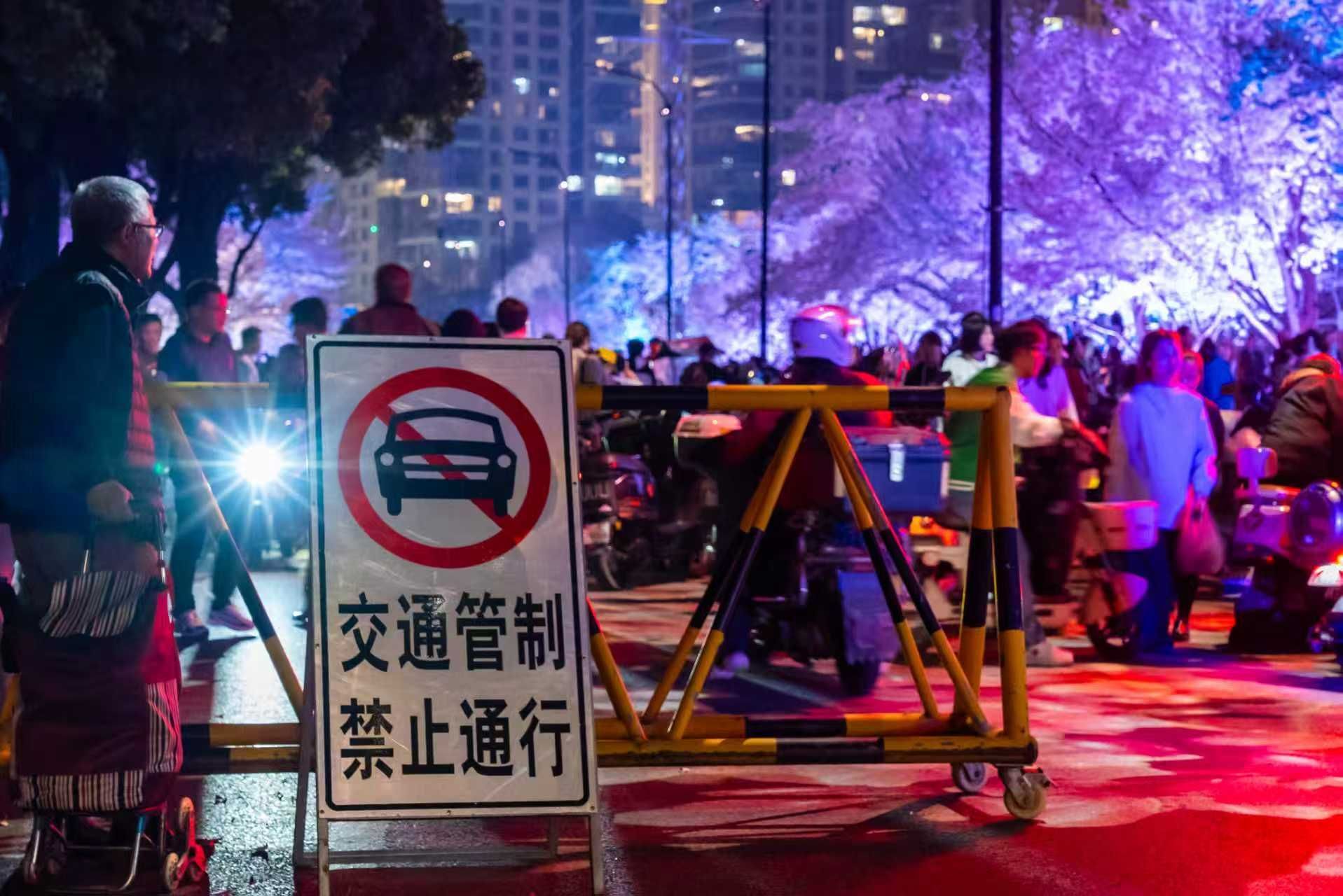 3月27日晚7时30分,黄孝西路西北湖路至西北湖东路段已竖起警示锥桶,车辆有序绕行。随着天色渐暗,这条平日里车流不息的交通干道,摇身一变成了市民游客的“专属赏花步道”。