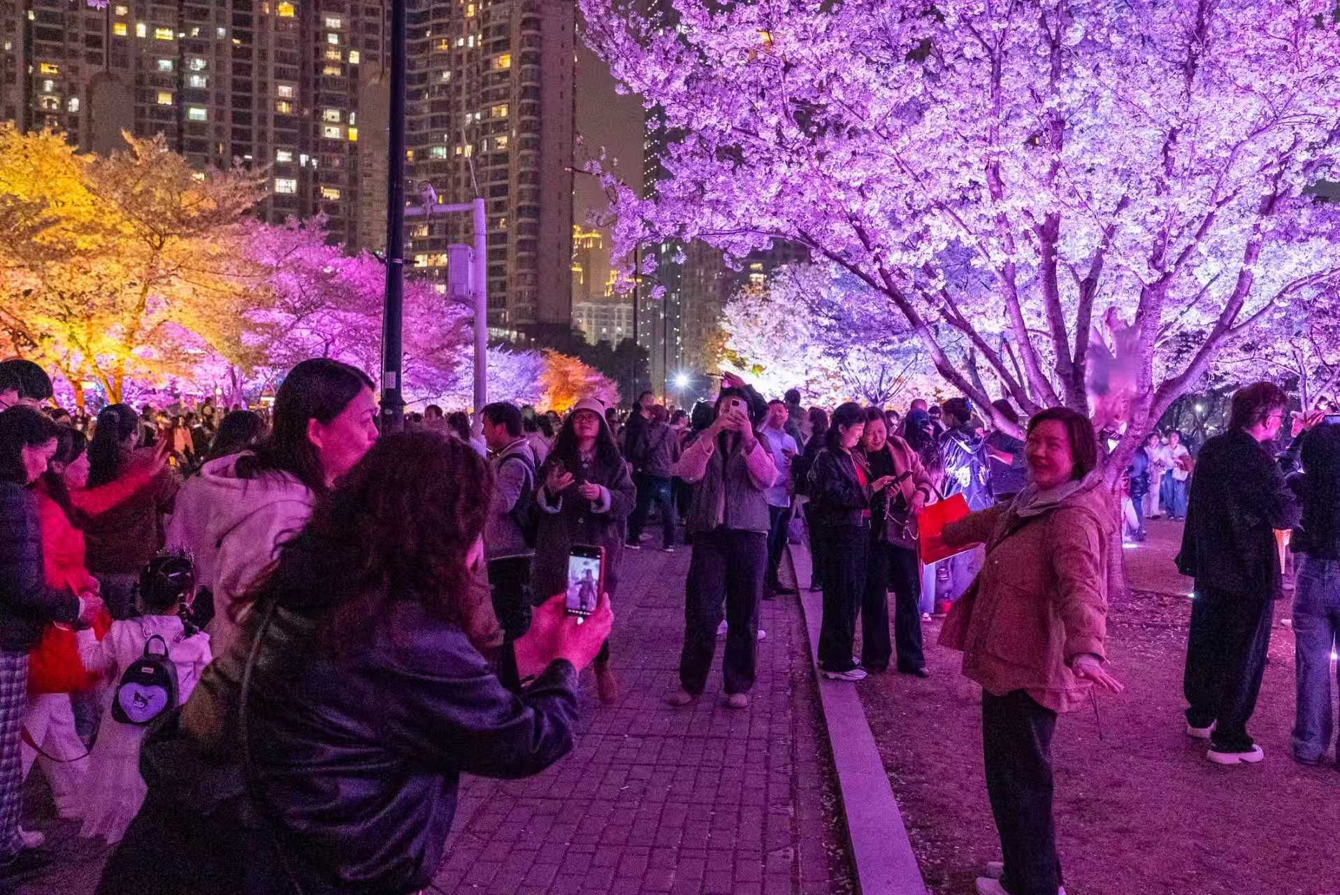 本周,江汉区西北湖绿化广场400余株樱花迎来最佳观赏期,夜色中花影摇曳,赏樱市民络绎不绝。为提升游客体验,黄孝西路西北湖绿化广场赏樱点实施了临时交通管制,在客流高峰时段将该路段改为“步行街”,让游客得以走上主路赏樱打卡。这一举措受到市民游客广泛好评。