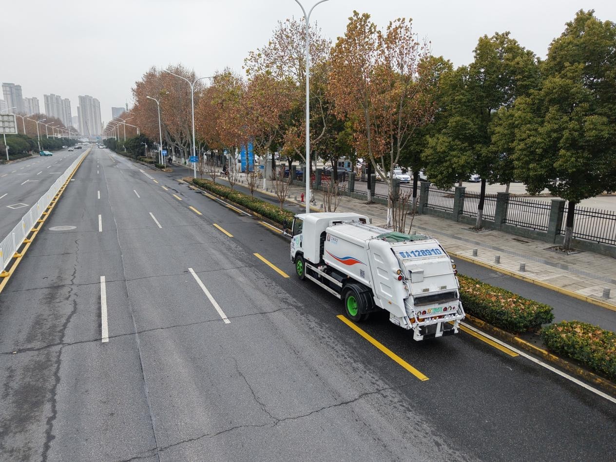 ▲整齐洁净的垃圾收运车在作业中。江岸城管 供图