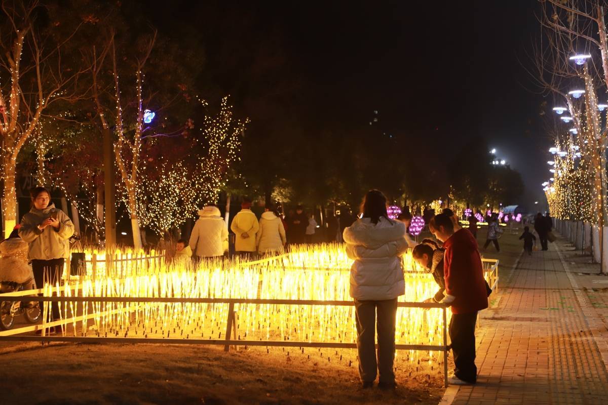 在广场区域,蓝色星光树与太空主题装置营造出科技感与节日感交融的跨年氛围;在部分绿化带,通过暖黄灯光与麦穗、蝴蝶造型灯的结合,展现田园生态意象;还有专门为亲子家庭设置的卡通趣味灯光区域,满足不同年龄段市民的观赏需求。