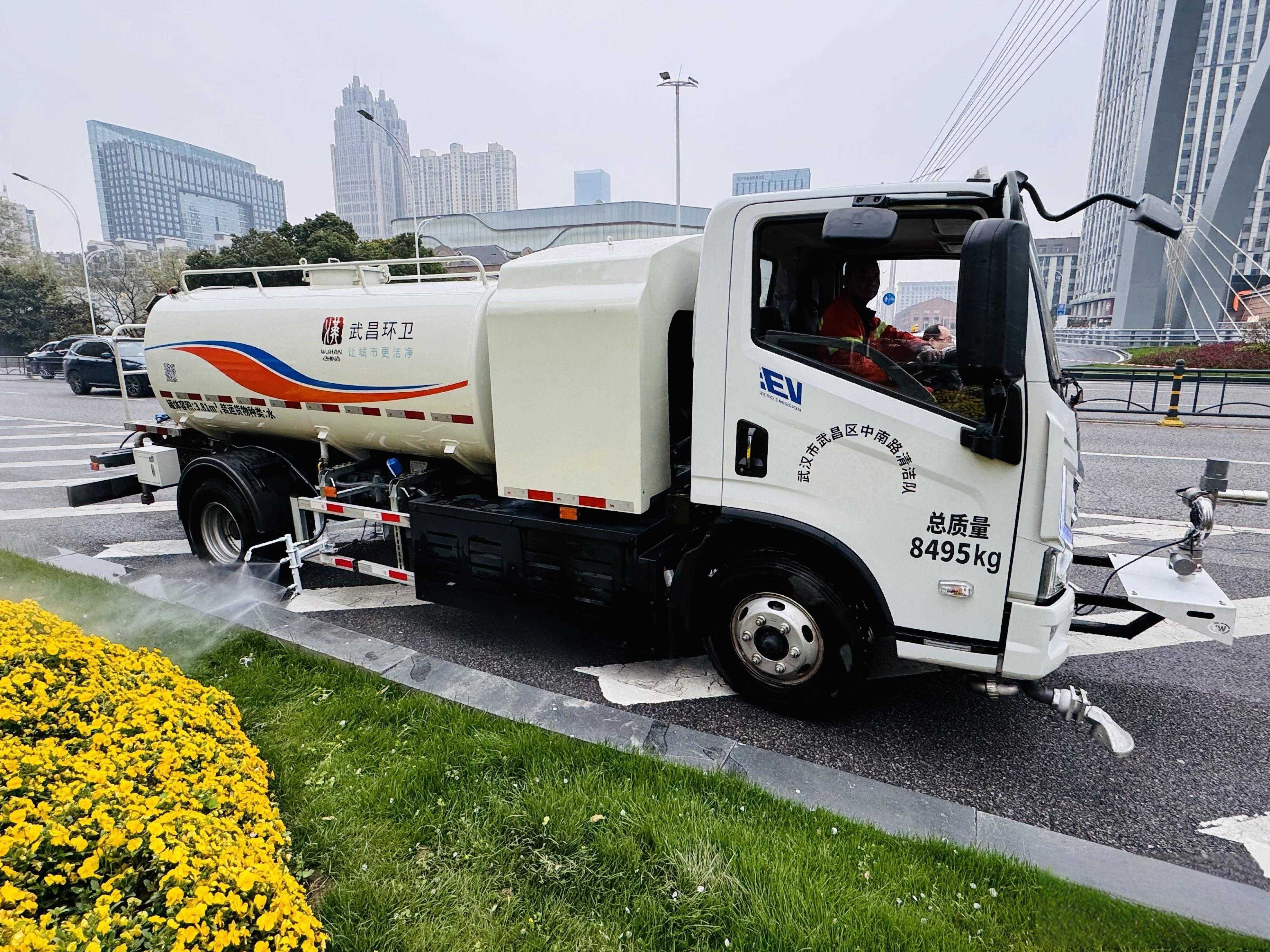 3月24日,春日的武昌楚汉路街头,环卫工人刘兴驾驶着一辆新能源清洗车上路作业,他轻按驾驶室内的按钮,车身上加装的专用喷嘴通过传感器接收指令,精准释放高压水雾,将站卧石上的尘土一冲而净,而花坛中的花草却丝毫不受影响。