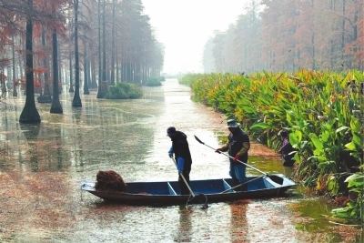 近年来,随着网络热度的持续攀升,涨渡湖公园吸引了越来越多的摄影爱好者和游客。18日,驱车从江北快速路、347国道至刘大路,再沿主港路前行。漫步于木质栈道,火红的池杉林尽收眼底。不远处,两名工作人员正驾船打捞飘落的池杉叶。区林科所工作人员朱春菊介绍,冬季的池杉尤为迷人,火红的树叶犹如晚霞般绚丽,但飘落的树叶要及时清理。